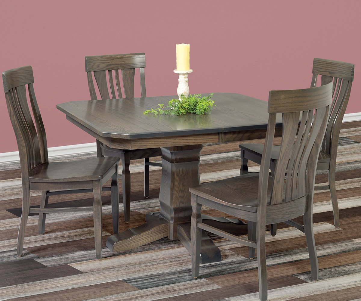Table shown 48″ square in oak with OCS-118 antique slate stain. Clip corner top with 1⁄2″ beveled edge. Fiona chairs.