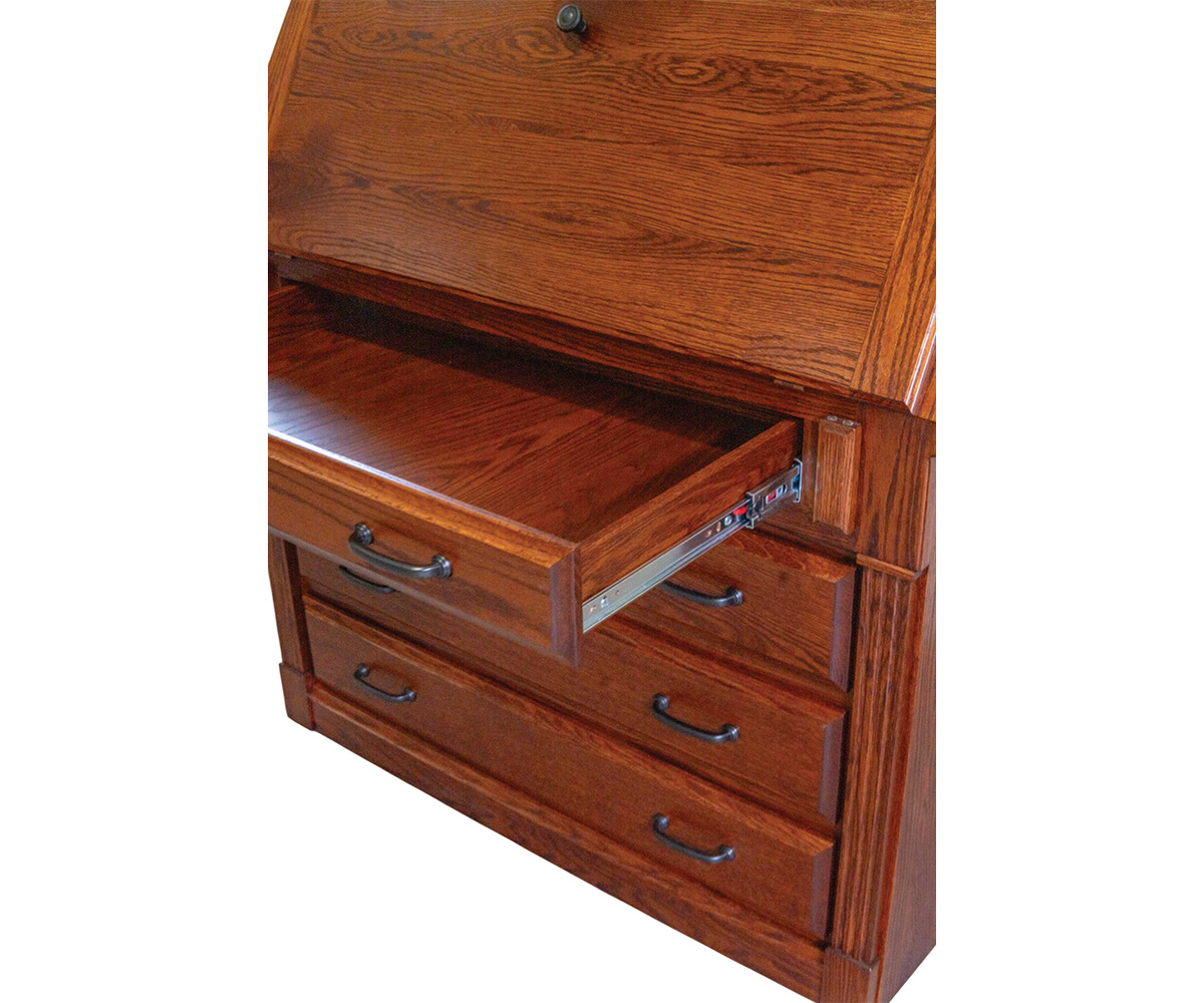 Features: • Hinged lid desk • Lid folds up to hide work space when not in use • Dovetailed drawers • Full extension drawer slides